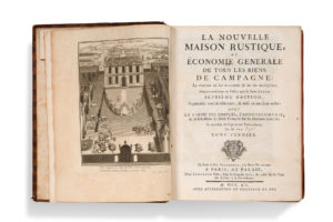 matières rurales... Paris, du fonds de Cl. Prudhomme, chez Saugrain père, 1755. 2 forts volumes in-4. Basane blonde, dos à nerfs titré et orné, tranches rouges (reliures d'époque). Septième édition de ce grand classique de l'économie rurale. L'illustration comprend un frontispice, des planches hors-texte gravées en taille-douce et de nombreuses figures gravées sur bois dans le texte. Vicaire, 521. (Reliures usagées, trou au 1er volume traversant 1er plat et quelques feuillets, bon état intérieur). PROVENANCE : Bibliothèque Marcel Jeanson (ex-libris imprimé contrecollé n°1582) ; Librairie Vve Pairault & Fils (étiquette contrecollée).The New Rustic House or general economy of all the goods of country: the way to maintain them & to multiply them. With the virtue of the simple, the apothecary, & the decisions of the French law on the rural matters... Paris, du fonds de Cl. Prudhomme, chez Saugrain père, 1755. 2 strong volumes in-4. Blonde basane, spine titled and decorated, red edges (period bindings). Seventh edition of this great classic of rural economy. The illustration includes a frontispiece, intaglio plates and numerous woodcut figures in the text. Vicaire, 521. (Worn bindings, hole in the first volume crossing the first cover and some leaves, good condition inside). PROVENANCE: Marcel Jeanson Library (printed bookplate pastedown n°1582); Librairie Vve Pairault & Fils (pastedown label).