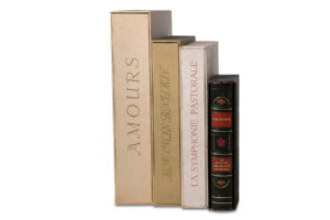 rempliée, chemise rigide titrée au dos et étui d'édition. Tirage à 600 exemplaires numérotés sur vélin blanc de Rives. Celui-ci l'un des 50 (n°69) auquel on a ajouté un état en noir avec remarques des gravures et une épreuve sur soie de la couverture. (Très bon état général malgré état d'usage de la chemise et étui). - DIGNIMONT André - LÉAUTAUD Paul, Amours, 1958. In-4, 145 pp. En feuilles, couverture imprimée titrée rempliée, chemise rigide titré au dos et étui d'édition. Tirage à 575 exemplaires numérotés sur vélin pur fil de Rives, celui-ci exemplaire hors-commerce avec envoi autographe signé à la justification par l'éditeur à Charles Grooshens. Contient joints à l'exemplaire - comme les 50 numérotés de 26 à 75 - un premier état en noir des illustrations, une suite des bois, une planche refusée en deux états, et deux feuilles d'esquisses. Très bel exemplaire. - SAUVAGE Sylvain - GANDON Yves, Le pavillon des délices regrettées, 1946. In-12, 161 pp. Plein maroquin brun noir, décor estampé polychrome et doré sur les plats, dos à nerfs orné, pièces de titre de maroquin rouge, tête dorée, couverture et dos conservés, étui. Gravures sur bois en couleurs d'après dessins de Sylvain Sauvage. Tirage limité à 990 exemplaires numérotés, celui-ci l'un des 40 sur vélin d'Arches (n°36) auquel est joint un dessin original signé de Sauvage (contrecollé en début de volume) et une suite en noir des gravures. TRÈS BEL EXEMPLAIRE (légers frottements aux mors). - SAUVAGE Sylvain - TILLIER Claude, Mon oncle Benjamin, 1943. In-8, 297 pp. En feuilles, non coupé, couverture imprimée et illustrée rempliée, chemise rigide titré au dos et étui d'édition. Tirage à 950 exemplaires numérotés sur vélin de Lana (celui-ci n°727). Bon exemplaire.[ILLUSTRATED BOOKS]. [ÉDITIONS MARCEL LUBINEAU] Set of 4 illustrated books by the publisher Marcel Lubineau, Paris: - CLOUZOT Marianne - GIDE André, La Symphonie pastorale, 1952. In-8, 116 pp. In sheets, illustrated printed cover, hardback folder with title on the spine and publisher's slipcase. Edition of 600 numbered copies on white vellum of Rives. This one is one of the 50 (n°69) to which we have added a black state with remarks of the engravings and a silk proof of the cover. (Very good general condition despite the used condition of the folder and case). - DIGNIMONT André - LÉAUTAUD Paul, Amours, 1958. In-4, 145 pp. In sheets, titled printed cover, hardback folder titled on the back and edition case. Edition of 575 numbered copies on vellum pur fil de Rives, this one being an off-market copy with an autograph letter signed at the justification by the publisher to Charles Grooshens. Contains enclosed to the copy - as the 50 numbered from 26 to 75 - a first state in black of the illustrations, a suite of woodcuts, a refused plate in two states, and two sheets of sketches. A very nice copy. - SAUVAGE Sylvain - GANDON Yves, Le pavillon des délices regrettées, 1946. In-12, 161 pp. Full black brown morocco, gilt and polychrome stamped decoration on the boards, ornate ribbed spine, red morocco title-pieces, gilt head, cover and spine preserved, case. Wood engravings in colours after drawings by Sylvain Sauvage. Limited edition of 990 numbered copies, this one of the 40 on Arches vellum (n°36) to which is attached an original signed drawing by Sauvage (pasted at the beginning of the volume) and a black suite of the engravings. VERY GOOD (slight rubbing to the spines). - SAUVAGE Sylvain - TILLIER Claude, Mon oncle Benjamin, 1943. In-8, 297 pp. In sheets, uncut, printed and illustrated cover filled, hardback folder titled on the back and publisher's slipcase. Edition of 950 numbered copies on Lana vellum (this one n°727). A good copy.