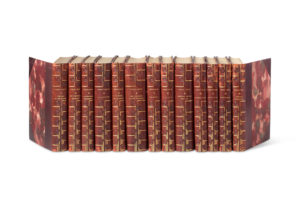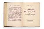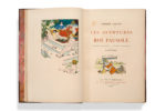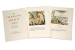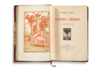 conservés. Tirage à 1800 exemplaires numérotés, celui-ci l'un des 55 sur Hollande Pannekoek (n°67). Nombreux fac-similés d'écrits de l'auteur. Contient : Journal intime 1882/1891 ; Poëtique suivi de théâtre, projets et fragments ; La Femme et le pantin suivi de Voyage en Espagne ; Les Chansons de Bilitis traduites du grec suivies de Chansons modernes ; Le Crépuscule des nymphes suivi de Lectures antiques ; Les Aventures du roi Pausole ; Archipel précédé de Dialogue sur la danse ; Poésies de Méléacre suivies de Mimes des courtisanes ; Contes précédé de Les trois roses de Marie Anne ; Poésies complètes ; Littérature suivie de Livres anciens et de Inscriptions et belles lettres ; Psyché ; Aphrodite. Moeurs antiques. (Ne contient pas les illustrations d'A. Calbet). - Les Aventures du Roi Pausole. Paris, G. & R. Briffaut Editeurs, collection «Le Livre du Bibliophile» 1924. In-4, 301 pp. Demi-maroquin brun à coins, dos lisse titré or et orné, tête dorée, couverture et dos conservés (P.L. Martin). Tirage limité à 1000 exemplaires numérotés. Celui-ci l'un des 925 sur vergé Van Gelder Zonen (n° 938). L'exemplaire est enrichi d'une lettre autographe signée de Pierre Louÿs, ainsi que son enveloppe, montés sur onglets en début de volume. Elle est adressée à « Madame Hugo Finaly » (1 p. ¼ à l'encre violette) : « [...] J'apprends à l'instant que vous avez la gracieuse intention d'offrir à Louise une table de jardin et que vous êtes venue hier à ce sujet. [...] ». Bel état (léger manque à la coiffe inférieure). - Contes choisis. Paris, Georges Crès et Cie, 1919. In-8, 281 pp. Demi-basane rouge à coins, dos lisse titré et orné, tête dorée (dos partiellement détaché). Frontispice gravé sur bois en couleurs par Gabriel Daragnès. - Les Chansons de Bilitis. Paris, Lallemand, 1946. In-folio (386 x 290 mm), VIII, 188 pp., en feuillets, impression en rouge et noir. Couverture rempliée, sous emboîtage toilé bleu. Illustré de cuivres originaux en couleurs de Jean BERQUE. Tirage limité à 125 exemplaires numérotés, l'un des 95 sur vélin de Rives (n° 119). (Emboîtage en fort état d'usage; couverture piquée; légères rousseurs). PROVENANCE : Bibliothèque Horace FinalyCollection of works - Complete works of Pierre Louÿs. Paris, Montaigne editions. 1929-1931. 13 volumes in-8. Half burgundy basane with corners, smooth spines titled, tomé and decorated, gilt heads, covers and spines preserved. Edition at 1800 numbered copies, this one of 55 on Hollande Pannekoek (n°67). Numerous facsimiles of the author's writings. Contains: Journal intime 1882/1891; Poëtique followed by Théâtre, projets et fragments; La Femme et le pantin followed by Voyage en Espagne; Les Chansons de Bilitis traduites du grec followed by Chansons modernes; Le Crépuscule des nymphes followed by Lectures antiques; Les Aventures du roi Pausole; Archipelago preceded by Dialogue sur la danse; Poems of Meleacre followed by Mimes des courtisanes; Tales preceded by Les trois roses de Marie Anne; Complete Poems; Literature followed by Ancient Books and Inscriptions et belles lettres; Psyche; Aphrodite. Moeurs antiques. (Does not contain the illustrations by A. Calbet). - The Adventures of King Pausole. Paris, G. & R. Briffaut Editeurs, collection "Le Livre du Bibliophile" 1924. In-4, 301 pp. Brown half-maroquin with corners, smooth spine titled in gold and decorated, gilt head, cover and spine preserved (P.L. Martin). Limited edition of 1000 numbered copies. This one is one of the 925 on Van Gelder Zonen laid paper (n° 938). The copy is enriched with an autograph letter signed by Pierre Louÿs, as well as its envelope, mounted on tabs at the beginning of the volume. It is addressed to "Madame Hugo Finaly" (1 p. ¼ in purple ink): "[...] I learn just now that you have the gracious intention of offering Louise a garden table and that you came yesterday about it. [...] ». Nice condition (slight loss at the lower cover). - Contes choisis. Paris, Georges Crès et Cie, 1919. In-8, 281 pp. Red half-basane with corners, smooth spine titled and decorated, gilt head (spine partially detached). Woodcut frontispiece in colour by Gabriel Daragnès. - Les Chansons de Bilitis. Paris, Lallemand, 1946. In-folio (386 x 290 mm), VIII, 188 pp. in leaves, printed in red and black. Filled cover, in blue cloth slipcase. Illustrated with original copperplates in colour by Jean BERQUE. Limited edition of 125 numbered copies, one of 95 on Rives vellum (n° 119). (The slipcase is in very good condition; the cover is spotted; slight foxing). PROVENANCE: Horace Finaly Library