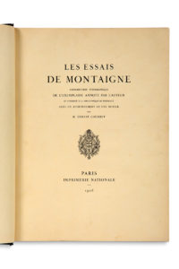 [MONTAIGNE Michel de]Les Essais de Montaigne. Reproduction typographique de l'exemplaire annoté par l'auteur et conservé à la bibliothèque de Bordeaux avec un avertissement et une notice par Ernest Courbet. Paris, Imprimerie Nationale, 1906-1931....