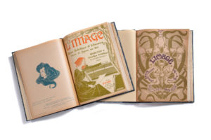 de luxe non coupée sur papier d'édition. Revue littéraire et artistique contenant des textes de Barrès, Louÿs, Margueritte, Montorgueil, Régnier, Verhaeren, etc... ornée de nombreuses planches de Carrière, Daumier, Degas, Denis, etc... Avec les couvertures des livraisons par Mucha, Toulouse-Lautrec. SUPERBE ÉTAT (état d'usage de l'étui). PROVENANCE: Collection David Wilkie Cooper[REVUE ILLUSTRÉE] L'Image Paris, Floury, December 1896 - December 1897. 12 issues in 4 volumes in-4. Half blue morocco, smooth titled spine, covers and spine preserved, titled case decorated with stamped motifs (publisher's bindings). Uncut deluxe edition on publisher's paper. Literary and artistic review containing texts by Barrès, Louÿs, Margueritte, Montorgueil, Régnier, Verhaeren, etc... decorated with numerous plates by Carrière, Daumier, Degas, Denis, etc... With the covers of the issues by Mucha, Toulouse-Lautrec. SUPERB CONDITION (used condition of the slipcase). PROVENANCE: David Wilkie Cooper Collection