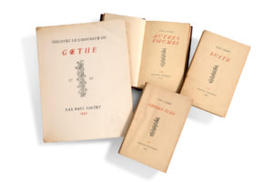 Goethe. 1933. In-4, broché, couverture rempliée, 63 pp. Un des 500 exemplaires numérotés sur vergé de Hollande Van Gelder (n°192). - Suite. 1934. In-12, broché, couverture rempliée, 179 pp. Un des 4000 exemplaires numérotés sur papier blanc d'Alfa (n°2461). - Autres Rhumbs. 1934. In-12, plein maroquin bordeaux, plats orné d'un motif végétal en son centre et d'un encadrement de filet doré, dos lisse titré or en long, tête dorée, gardes de papier rouge doré, couverture conservée (reliure postérieure), 265 pp. Un des 4000 exemplaires numérotés sur papier blanc d'Alfa (n°769) (coiffes frottées).Set of 4 books in the NRF Gallimard collection - Choses tues. 1932. In-12, paperback, filled cover, 221 pp. One of 4000 numbered copies on white Alfa paper (n°2973). - Speech in honor of Goethe. 1933. In-4, paperback, filled cover, 63 pp. One of 500 numbered copies on Hollande Van Gelder laid paper (n°192). - Suite. 1934. In-12, paperback, filled cover, 179 pp. One of 4000 numbered copies on Alfa white paper (n°2461). - Autres Rhumbs. 1934. In-12, full burgundy morocco, boards decorated with a plant motif in the centre and a gilt fillet frame, smooth spine titled in gold throughout, gilt head, red gilt paper endpapers, cover preserved (later binding), 265 pp. One of 4000 numbered copies on white Alfa paper (n°769) (rubbed headbands).
