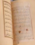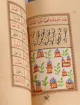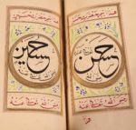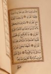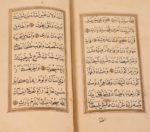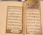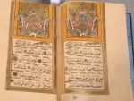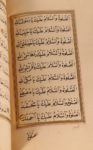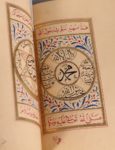 sourates du Coran, d'invocations de noms divins, de noms des premiers califes, et d'un grand nombre de prières classiques, ou d'autres moins connues telle que la "prière du Nouvel an". Le texte principal en écriture naskhréparti sur 9 lignes par page comporte des filets d'encadrement et des rosettes de séparation à l'or, et des titres à l'encre rouge. De nombreuses pages sont finement enluminées de grands médaillons calligraphiques sur fonds de motifs floraux polychromes. Il comporte également nombre d'illustrations polychromes d'objets talismaniques ou d'architectures. Une note dans un médaillon enluminé indique que le manuscrit fut "conservé" par "Mu??afa ?ilmi et son professeur, al-?ajj Mu?ammad Wa?fi, en l'an 1288". Le terme "conservé" peut être entendu comme "préservé", "sauvegardé", avec une dimension presque talismanique s'il se rapporte au manuscrit (mot souvent utilisé pour les amulettes). Si le terme se rapporte au texte en lui-même, il peut alors être entendu comme un synonyme de "copié". Il comporte une reliure en cuir bleu estampée et dorée de motifs floraux dans des filets d'encadrement, et d'un étui en cuir de même décor. (Expert : Alexis RENARD alexisrenard.com )