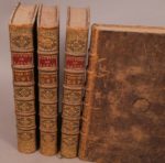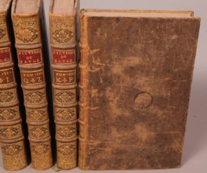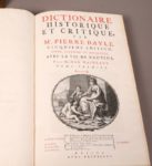 Pierre Mortier, etc. ; Leyde : Samuel Luchtmans ; La Haye : P. Gosse, J. Neaulme, A. Moetjens, G. Block, A. van Dole ; Utrecht : Étienne Neaulme, 1740. 4 volumes in-folio, reliés veau brun, dos à nerfs orné, tranches rouges.Huitième édition du célèbre Dictionnaire de Pierre Bayle, reproduisant la cinquième parue en 1730. Chaque titre est orné d'une vignette.