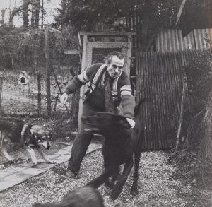 DOUCET (Louis). Louis-Ferdinand Céline, jeu avec ses trois chiens dans le jardin de Meudon. 1957-1959. Épreuve gélatino-argentique des années 1990. Signature du photographe au dos en dessous de l'envoi " Ce voyage au bout de Meudon, amicalement...