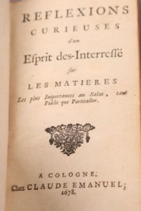 [SPINOSA (Baruch)]. Réflexions curieuses d'un esprit des-interessé sur les matières les plus importantes au salut, tant public que particulier. Cologne, chez Claude Emanuel, 1678. Petit in-12 relié basane brune ancienne, dos à nerfs orné,...
