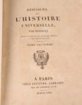 BOSSUET. Discours sur l'Histoire universelle. Paris, Lefèvre, 1823. 2 volumes grand in-8, reliés demi-basane maroquinée verte à petits coins, dos richement ornés. (Simier, rel du Roi). Quelques rousseurs.2 portraits-frontispices dont un en deux...