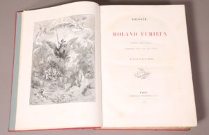 [DORE]. ARIOSTE. Roland Furieux. Poème héroïque traduit par A.-J. du Pays, Paris: Librairie Hachette, 1879. In-folio. Cartonage de l'éditeur toile rouge ornée de fers dorés originaux. 1er tirage des 618 gravures de Gustave Doré : 1...
