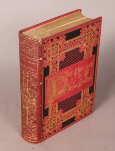 FROISSART. Les Chroniques. Paris, Hachette, 1881. Grand in-8 relié demi-chagrin rouge, dos orné, plats de percaline rouge décorés d'une composition noir et or, tranches dorées.Illustrées de 11 planches en chromolithographie, 12 lettres et...