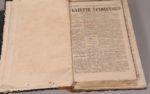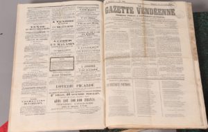 Gazette Vendéenne (La). Du 1° Janvier 1853 au 30 décembre 1854 (n°209 à 313) ; Du 6 janvier 1855 au 26 décembre 1857 (n° 314 à 369 pour 469) forte mouillure sur le n°369; Du 2 janvier 1858 au 24 décembre 1858 et du 7 janvier 1860 au 28...