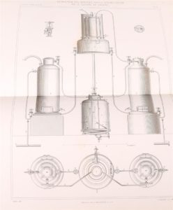 PAYEN (A.). Précis de chimie industrielle. Quatrième édition. Paris, Hachette, 1857-59, 3 volumes in-8 (2 volumes de texte et 2 tomes d'atlas en un volume) reliés demi-chagrin vert, dos à nerfs, filet doré sur les nerfs.Illustré de 268 figures...
