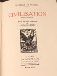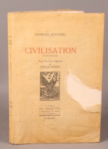 [DESLIGNIERES]. DUHAMEL (Georges). Civilisation 1914-1917. Avec les bois originaux de Deslignières. Paris, Chez André Coq (et) C. Pinault, 1927. In-8, broché. Tirage à 500 exemplaires numérotés, celui-ci un des 49 exemplaires sur Japon avec...