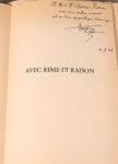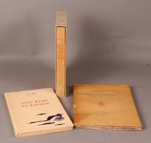 numérotés sur alfa du Marais. - [ROCHEGROSSE]. MAUCLAIR (Camille). Le poison des pierreries. Compositions de Georges Rochegrosse. Paris, Ferroud, 1903. Grand in-8 broché. Illustré d'eaux-fortes en couleurs de G. Rochegrosse. (Rousseurs). - [FEVE]. TRUC (Louis). Avec rime et raison. Poemes. Illustrations de Pierre Fève. Paris, l'auteur à l'enseigne Le Troll, 1968. In-8 en feuilles, couverture illustrée rempliée. Edition originale tirée à 300 exemplaires numérotés. Envoi autographe signé de l'auteur. Joint une carte autographe signée « L.T. » de l'auteur. Les 3 volumes :