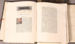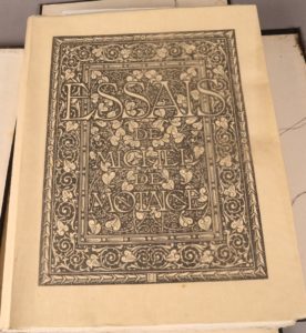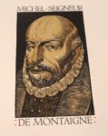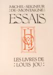imprimée et ornée par Louis Jou.Tirage à 170 exemplaires, celui-ci l'un des 125 sur papier Guarro à la forme (N° 55).Ouvrage imprimé en rouge et noir, avec des caractères créés pour l'édition. Les titres frontispices, les grands portraits de Montaigne et environ 200 en-têtes, culs-de-lampe et lettrines historiées ont été dessinés et gravés sur bois par Louis Jou.Le texte est celui de l'exemplaire dit de Bordeaux.
