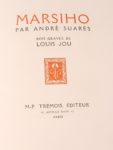 [JOU]. SUAREZ. Marsiho. Bois gravés de Louis Jou. Paris, Trémois, 1931. In-4 broché, couverture illustrée rempliée, chemise et étui.Premier tirage des 60 bois gravés en couleurs de Louis JOU, dont 6 hors-texte, avec suite des bois gravés de...