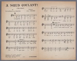 CÉLINE (Louis-Ferdinand). A nœud coulant. Chanson de Louis-Ferdinand Céline. Musique de Jean Noceti. Paris, Éditions J.-D.-C. Noceti, 1936. Un feuillet double in-4 (papier jauni comme toujours ; 2 petites déchirures sans manque aux plis). Rare...