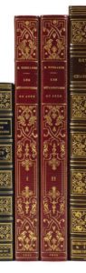 Deux volumes in-8, demi-maroquin grenat à grain long avec coins, dos ornés en long, non rognés, couvertures illustrées d'une vignette sur chaque plat et dos conservés (Canape).