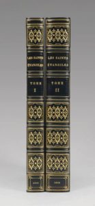 Frontispice en chromolithographie, 22 gravures hors texte, dont douze sur acier protégées par des serpentes imprimées sur papier de soie, et dix sur bois, ces dernières tirées sur chine appliqué, et deux cartes coloriées. En-têtes et lettrines gravés sur bois, ceux du Discours préliminaire ici finement rehaussés en couleurs et à l'or. Le texte des Evangiles est encadré d'une bordure gravée sur bois. Chaque évangéliste est illustré d'un frontispice spécial gravé sur bois, compris dans la pagination.