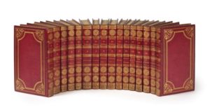 Seize volumes in-12, reliures de l'époque en maroquin rouge à grain long, sur les plats guirlande dorée se recourbant aux quatre angles pour faire place à des écoinçons dorés aux petits fers dans un encadrement de deux filets dorés et d'une guirlande à froid, dos à nerfs ornés, roulette intérieure, tranches dorées (Simier).