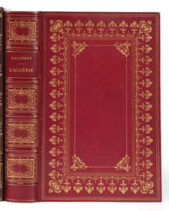 24 planches hors texte sous serpentes gravées sur acier par Rouargue frères, en-têtes, culs-de-lampe et 12 planches hors texte de costumes militaires coloriés gravés sur bois d'après Raffet et une carte dépliante coloriée de l'Algérie.