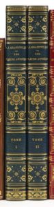 Deux volumes grand in-8, demi-maroquin bleu avec coins, dos à nerfs ornés de fers rocaille, non rogné, couverture illustrée et dos conservés (V. Champs).
