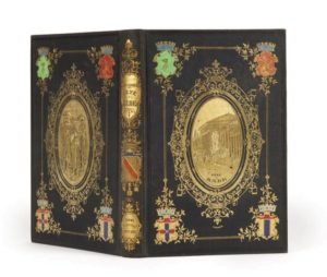 Grand in-8, cartonnage en percaline bleu nuit de l'éditeur, grandes plaques dorées différentes sur chaque plat avec blasons mosaïqués aux angles, dos orné en long, tranches dorées (Lenègre).