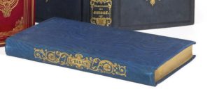 In-8, percaline saumonée bleue de l'éditeur, dos orné en long d'arabesques dorées avec titre en réserve dans un écusson, grades de moire gaufrée blanche, tranches dorées.
