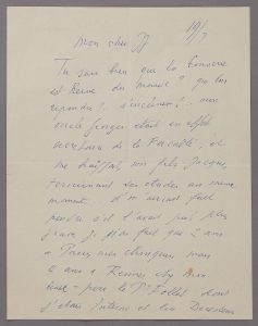 confession (ou provocation ?) à propos de ses années de jeunesse : " Tu sais bien que la connerie est reine du monde ? que lui répondre ?… s'incliner !… mon oncle Georges était en effet secrétaire de la Faculté, et me haïssait […] ; Il parle de sa formation médicale, […] 4 ans à Rennes chez mon beau-père le Pr Follet dont j'étais l'interne et lui Directeur de l'École ! d'ailleurs fort riche le bougre 500 000 frs or de rentes et autant en clientèle ! ma folie d'indépendance m'a fait secouer ce havre où je n'avais qu'à laisser venir… moi né si miteux ! là je suis impardonnable… les cons ne savent rien ! […]. La lettre contient encore une " question des trois points ", et [Pierre-Antoine] Cousteau, " abruti cabotin député blackboulé ", puis s'interrompt, une page suivante doit manquer.