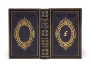 Grand in-8, reliure de l'époque en chagrin violet, sur les plats grand médaillon doré richement décoré entouré d'arabesques à froid avec initiale F au centre du plat supérieur, le tout dans un encadrement de filets dorés et d'un listel à froid, dos à nerfs orné, doublure et gardes de moire blanche, tranches dorées.