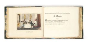 Petit ouvrage rare, amusant et instructif, dédié à la jeunesse des deux sexes (titre de couverture), illustré d'un titre gravé et six jolies vignettes hors texte en taille-douce finement coloriées avec rehauts d'or, décrivant tantôt en vers tantôt en prose 72 caractères.