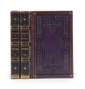 Trois volumes in-8, reliures de l'époque en maroquin à grain long violet, grande plaque à la cathédrale entourée de filets et fleurons dorés en encadrement sur les plats, dos à nerfs ornés de motifs à froid rehaussés de filets et fleurons dorés, coupes décorées de hachures dorées, roulette à froid et filets dorés intérieurs, tranches dorées (Simier, R. du Roi).
