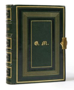 In-12, reliure de l'époque en chagrin vert, multiple encadrements de filets dorés et listels à froid sur les plats avec chiffre doré au centre, dos à nerfs orné de même, filets dorés intérieurs, fermoir de cuivre doré à motif de croix, tranches dorées.