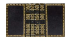 Quatre volumes in-8, reliure de l'époque en maroquin bleu nuit à grain long, filets et guirlande dorée en encadrement sur les plats, dos ornés, roulette intérieure, tranches dorées (Simier).