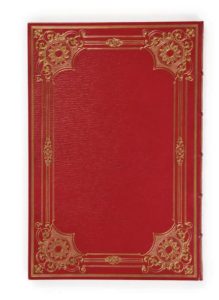 Grand in-8, maroquin rouge à grain long, multiples jeux de filets dorés avec fleurons latéraux et importants motifs d'angle en encadrement sur les plats, large retour intérieur orné d'une guirlande dorée encadrée de filets, tranches dorées sur témoins, double couvertures et dos conservés, étui (Chambolle-Duru).