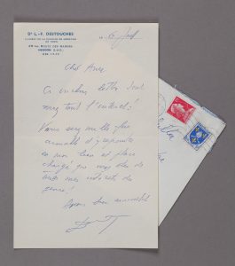CÉLINE (Louis-Ferdinand). Lettre autographe signée " Destouches ", accompagnant l'envoi d'un document, [adressée à Paul Chambrillon]. 6 juillet [1957] ; 1 page in-8 (pli léger), sur papier à en-tête " Dr. L.-F. Destouches ". Enveloppe...