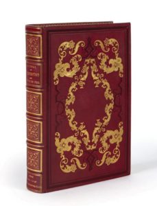 Grand in-8, reliure de l'époque en chagrin rouge, plats ornés d'un important décor rocaille exécuté aux petits fers dorés à fond azuré et listels à froid, dos à nerfs orné dans chaque caisson d'arabesques et fleurons dorés dans un cadre de filets gras et maigres avec ex-dono en lettres dorées dans le caisson inférieur, dentelle intérieure, doublure et gardes de moire blanche, tranche dorées.
