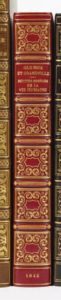 Grand in-8, maroquin rouge, encadrement de six filets dorés gras et maigres, dos à nerfs orné, dentelle et filets intérieurs, non rogné, couverture illustrée et dos conservés (Champs).