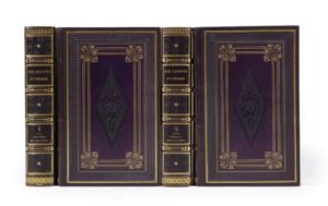 Quatre volumes in-8, reliures de l'époque en maroquin à grain long aubergine, multiples encadrements de guirlandes à froid et de filets dorés sur les plats, quatre d'entre eux s'entrecroisant pour dessiner de grands motifs d'angle, dos à nerfs ornés de motifs dorés et à froid, roulette à froid et filets dorés intérieurs, tranches dorées (Purgold).