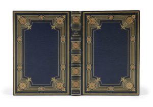 Grand in-8, maroquin à grain long bleu nuit, sur les plats, large encadrement de multiples filets, droits et courbes, pleins et pointillé, or et à froid, avec fleurons d'angle, l'ensemble délimitant des compartiments ornés de palmettes mosaïquées de maroquin rouge et lavallière, dos à nerfs orné de même, tranches dorées sur témoins, couverture illustrée conservée, étui (Mercier sr de Cuzin).