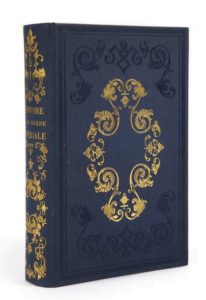 Grand in-8, cartonnage de l'éditeur en percaline bleu nuit, grands motifs d'arabesques dorées et à froid sur les plats, dos long orné de même, tranches dorées.
