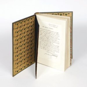Imprimé sur papier de Chine, avec le premier titre à l'adresse de la rue Saint-Anne et la très rare première couverture bleue quadrillée en parfait état, bien complet de toutes ses serpentes imprimées et de la carte coloriée d'Ile de France, il a été enrichi des pièces suivantes: 1° La couverture imprimée en or sur papier blanc glacé illustrée d'un motif indien au centre des plats, très rare également, destinée aux exemplaires de présent pour le jour de l'an 1838, ici conservée avec son dos à l'état de neuf.