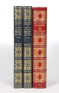 Deux volumes in-8, demi-maroquin noir à grain long avec coins, dos à nerfs ornés, non rognés, couvertures illustrées et dos conservés (Noulhac).
