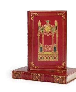 Ensemble deux ouvrages en deux volumes in-8, reliures de l'époque en maroquin rouge, sur les plats grande plaque à la cathédrale dorée et mosaïquée en rouge, vert, citron et violet, dans un encadrement de filets dorés aboutissant à des fleurons d'angle, dos à nerfs orné de même, roulette intérieure, gardes de papier moiré bleu, tête dorée, non rogné (Hering et Muller).