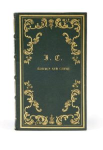 In-8, reliure de l'époque en chagrin vert, deux filets dorés gras et maigre en encadrement sur les plats avec grands motifs dorés de style rocaille terminés par des fers floraux aux angles, chiffre doré avec la mention édition sur chine en lettres dorées au centre du premier plat, dos à nerfs orné de filets dorés, roulette intérieure, tranches dorées.