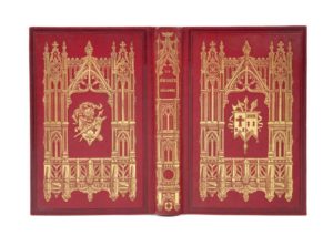 Grand in-8, reliure de l'éditeur en chagrin rouge, grande plaque dorée à la cathédrale couvrant les plats avec armoiries au premier plat et attributs militaires au second, dos long orné de même, tranches dorées.