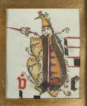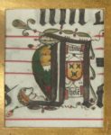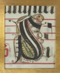 Hymnes pour le 3e dimanche après l'octave de Pâques, à vêpres ; feuillet d'antiphonaire avec musique notée carrée sur des portées tracées en rouge ; rubrique, Sabbato ante .iii. dominicam post octavus pasche ad vesperas ; initiale “S” historiée, Le Christ parmi les apôtres (dimensions : 75 x 70 mm) ; bordure sur fond d'or, décor illusionniste ganto-brugeois avec fruits, fleurs et papillons [dimensions en hauteur du feuillet tronqué en largeur : 488 mm] ; 28 initiales cadelées disposées en colonnes de part et d'autre de l'extrait de l'antiphonaire, avec un grand nombre de personnages (moines, femmes), grotesques, profils divers, bestiaire ; quelques initiales cadelées avec devises en latin : “Ave Maria” ; “Memento Mori” ; une initiale cadelée dotée d'armoiries, décrites comme suit : “D'or à trois fers de moulin de gueules” ; il est difficile de déterminer si ces armoiries se rapportent ou non au commanditaire du manuscrit d'origine, toutefois il est intéressant de noter qu'il y a une famille Montfort ou Montfoort (van), originaire de la province d'Utrecht, mais avec des attaches dans le Hainaut qui porte ces armoiries (voir Riestap et Armorial de Saint-Antoine-en-Barbefosse, lieu-dit dans le bois d'Havré (Mons) ; l'ordre de Saint-Antoine-en-Barbefosse était un ordre de chevalerie hainuyer fondé au XIVe siècle, antérieur à celui de la Toison d'or).