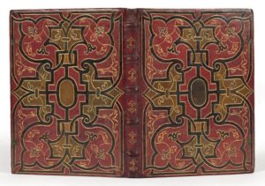 In-4 de (60) ff., dont un titre-frontispice gravé, 17 ff. de texte (privilège, avis au lecteur, pages de texte explicatif alternant avec les gravures), le feuillet final portant au verso la marque typographique, et 41 ff. de gravures à pleine page : maroquin rouge, plats entièrement couverts d'un grand décor compartimenté dessiné par des listels noirs droits et courbes, sertis de filets dorés et ponctués ici et là de grands rinceaux dorés, se déployant en réseau à partir d'un médaillon ovale mosaïqué de vert olive au centre, deux compartiments mosaïqués havane et quatre autres aux points cardinaux de couleur vert olive, compartiments en bordure orné d'un fond criblé, traces de rubans de soie, dos orné de petits fleurons mosaïqués répétés, tranches dorées (reliure de l'époque).