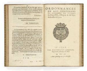 - Ordonnances du Roy, contenans les reiglemens des ouvriers en draps d'Or, d'Argent & de Soye de la ville de Lyon. Lyon, Barthélemy Ancellin, 1609.