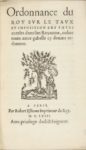 - Ordonnance du Roy sur le faict des draps et fils d'or, d'argent & de soye, & autres marchandises foraines d'Italie, Espaigne & Levant, entrants en son Royaume. Paris, Robert Estienne, 1566. Brunissures en pied du titre.