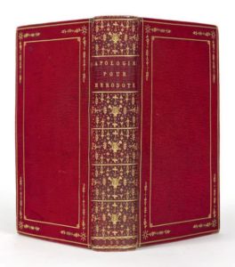 Relié avec : [ESTIENNE (Henri)]. Avertissement [...], touchant ceux qui sans prendre garde à l'argument, en jugent & parlent à la volée [...]. Sans lieu ni date [Genève, Henri II Estienne, 1567]. 2 ouvrages en un volume in-8, de (16) ff. et 572 pp. ; (24) ff. : maroquin rouge à grain long, encadrement dessiné par deux filets et des motifs dorés dans les angles, dos lisse richement orné, roulette intérieure, tranches dorées (reliure anglaise vers 1790-1800).